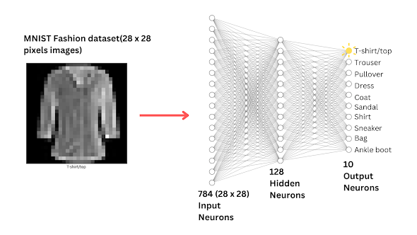 Example from Fashion-MNIST: 28×28 pixels → Dense(128) → Dense(10)