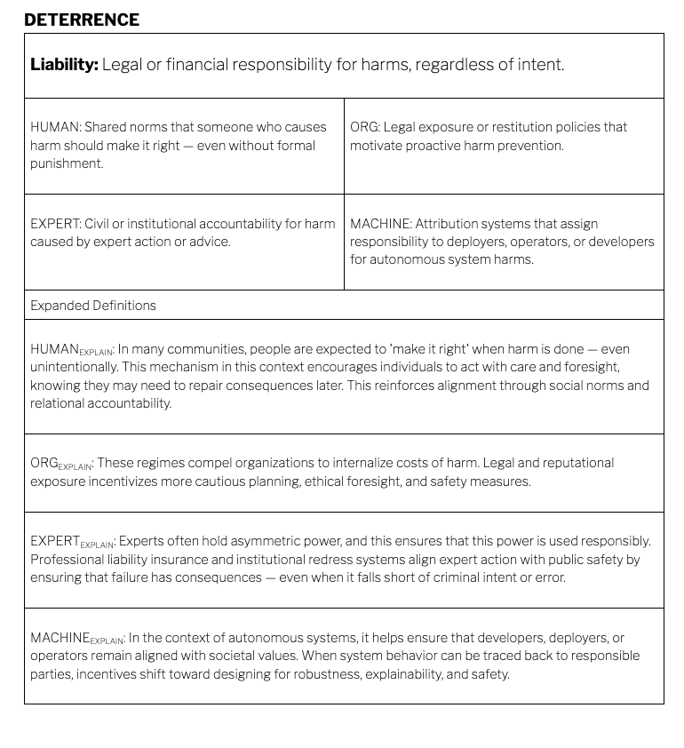Deterrence assumes that agents will sometimes cause harm, fail in their roles, or break rules but that alignment can facilitated by predictable responses to these. Mechanisms of liability, malpractice, and sanctioning rule violation reduce the impunity attached to misalignment.