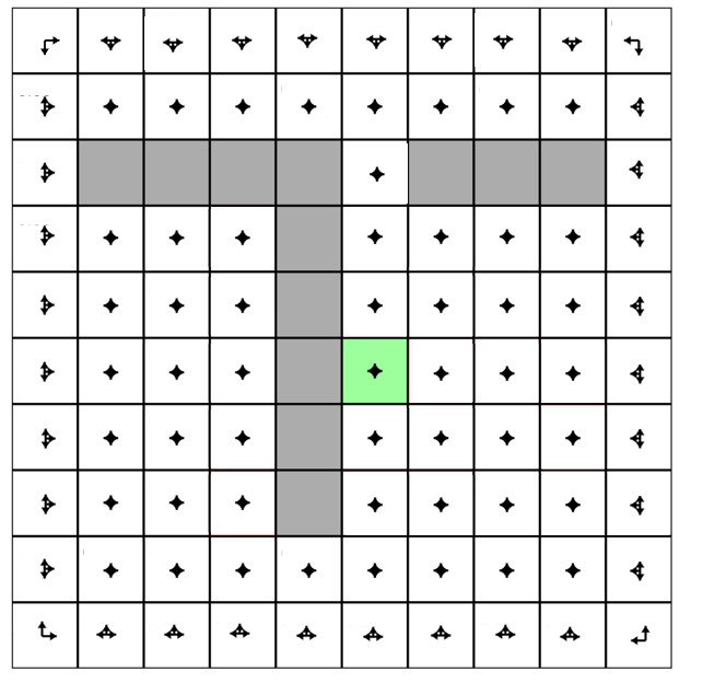 - The world has 10x10 = 100 distinct states. Gray cells are walls that block the agent.
