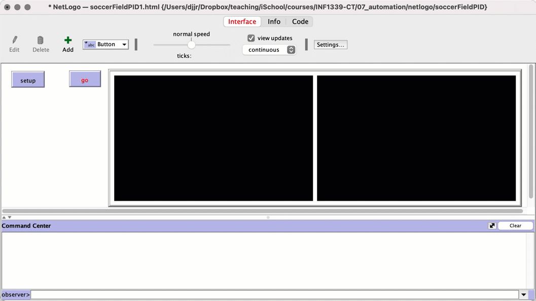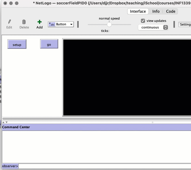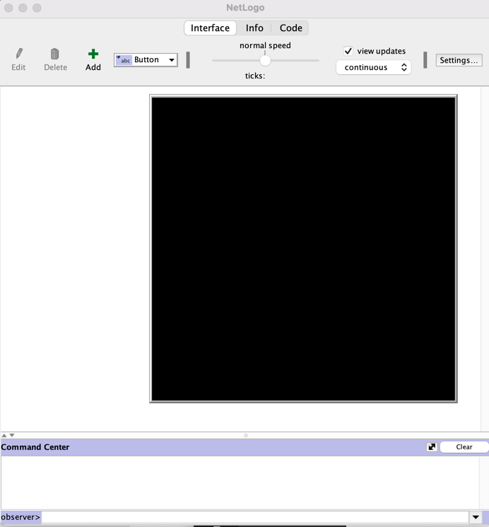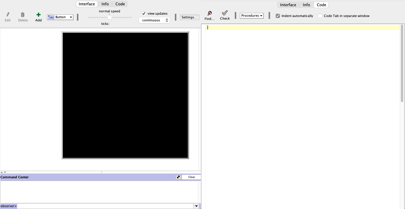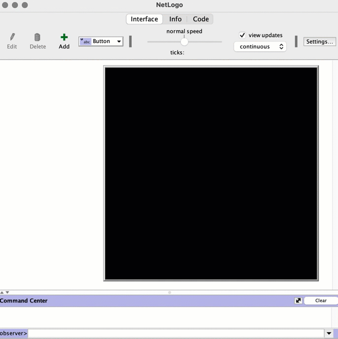 The "INTERFACE" consists of a UI (switches, buttons, etc.) and a "gridworld" where squares are called "patches" and a command center where we can interact directly with the underlying code.