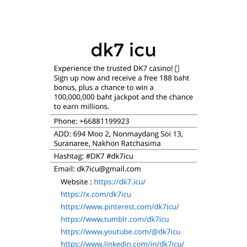 สัมผัสประสบการณ์คาสิโน DK7 เชื่อถือได้ 🎲 สมัครใหม่รับโบนัสฟรี 188 บาท พร้อมลุ้นแจ็กพอต 100,000,000 และโอกาสสร้างรายได้หลักล้าน Website : https://dk7.icu/ Phone: +66881199923