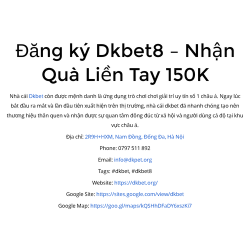 Địa chỉ: 2R9H+HXM, Nam Đồng, Đống Đa, Hà Nội Phone: 0797 511 892 Email: info@dkpet.org Tags: #dkbet, #dkbet8 Website: https://dkbet.org/ Google Site: https://sites.google.com/view/dkbet Google Map: https://goo.gl/maps/kQSHhDFaDY6xszKi7