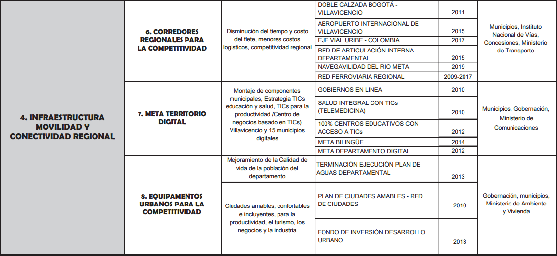En el año 2032, el Departamento del Meta contará con infraestructura y conectividad segura y de calidad que garanticen condiciones de exportación y movilidad interna ubicándolo entre los cinco departamentos más competitivos del país.