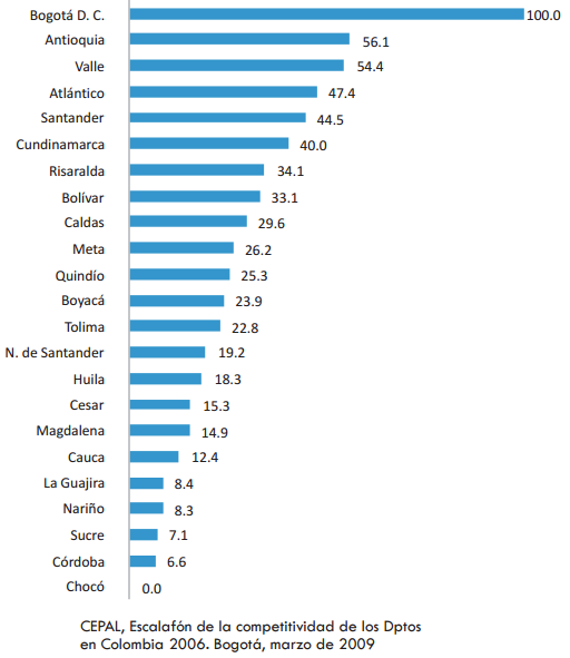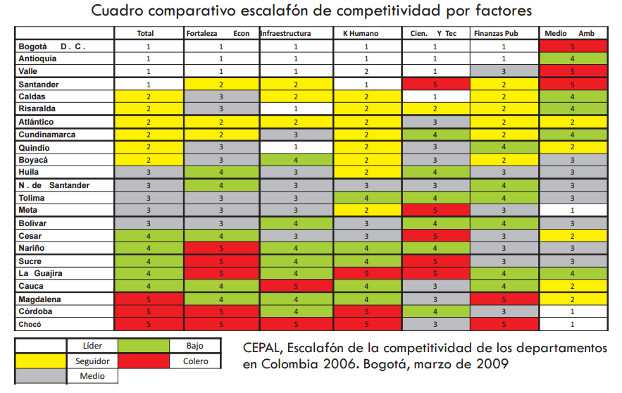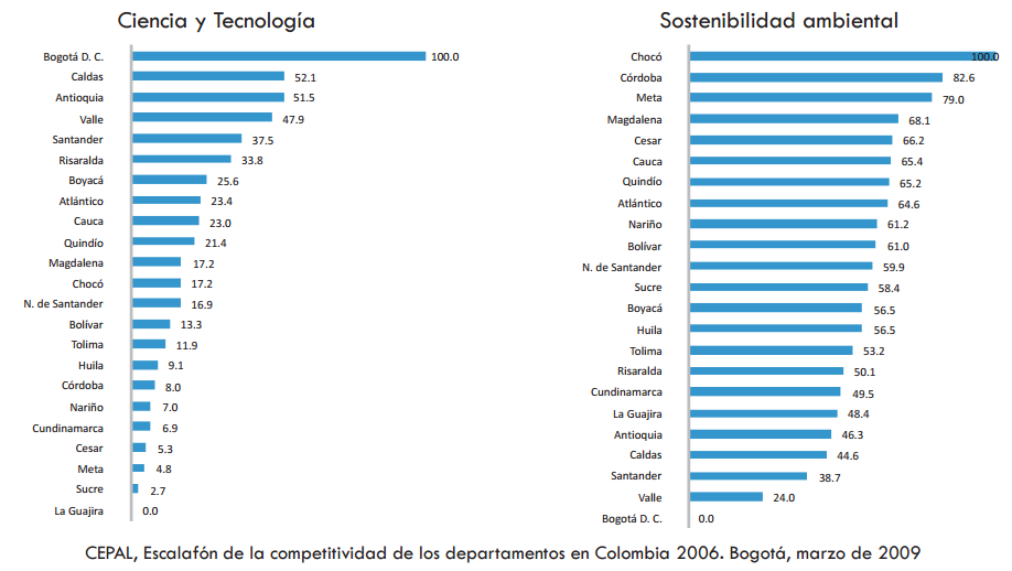 Según el estudio de la CEPAL (2009) el Departamento del Meta mejoró con relación a la anterior medición de competitividad ubicándose en el medio con relación a los demás departamentos. Su principal debilidad radica en los factores relacionados con la apropiación de la ciencia y la tecnología y mantiene como las dos principales fortalezas el capital humano y los factores relacionados con el medio ambiente. Cabe anotar que en términos cuantitativos desmejoró, pasando del puesto 13 al puesto 14, lo que demuestra que aunque el departamento ha venido avanzando en su competitividad, existen otros departamentos que lo están haciendo mucho más rápido.
