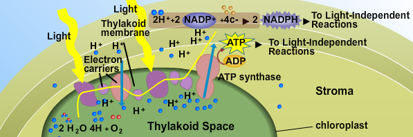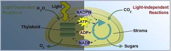 Chlorophyll absorbs the energy from the sun and transfers it to high-energy electrons that are carried through a series of proteins called electron transport. Of course NADPH has to become buddies with the high energy molecules or else it wont work, so they accept each other. NADPH carries them and the energy to the next phase. Although carbon is not used in this reaction it is needed to help Light-independent reaction. This reaction uses hydrogen and oxygen molecules to gain energy and accept oxygen by releasing carbon dioxide and accepting oxygen.