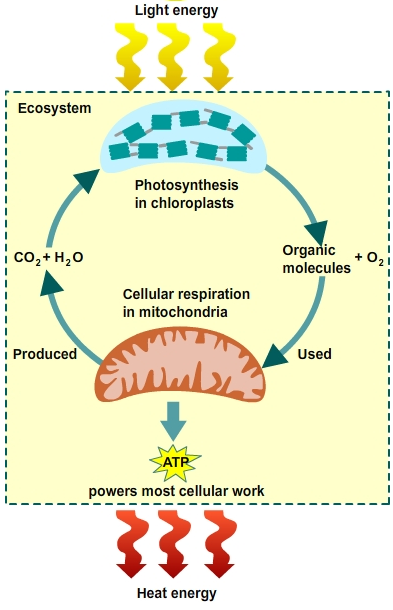 In the process photosynthesis takes the energy from the sun and turns it into organic molecules (O2) When the O2 is used it creates ATP, Energy! Once energy is created it forms into carbon and water. The two work together to from carbon so that it can function, grow, and move. Lets make sure that we know photosynthesis removes carbon dioxide and releases oxygen gas. Respiration uses oxygen and releases carbon dioxide.