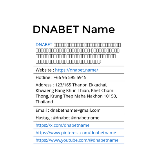 DNABET คือผู้นำด้านความบันเทิงในตลาดการพนันในปัจจุบัน ในบทความนี้ เราจะมาสำรวจผลิตภัณฑ์และบริการยอดนิยมของสนามเด็กเล่นกัน! Website : https://dnabet.name/ Hotline : +66 95 595 5915 Address : 123/165 Thanon Ekkachai, Khwaeng Bang Khun Thian,