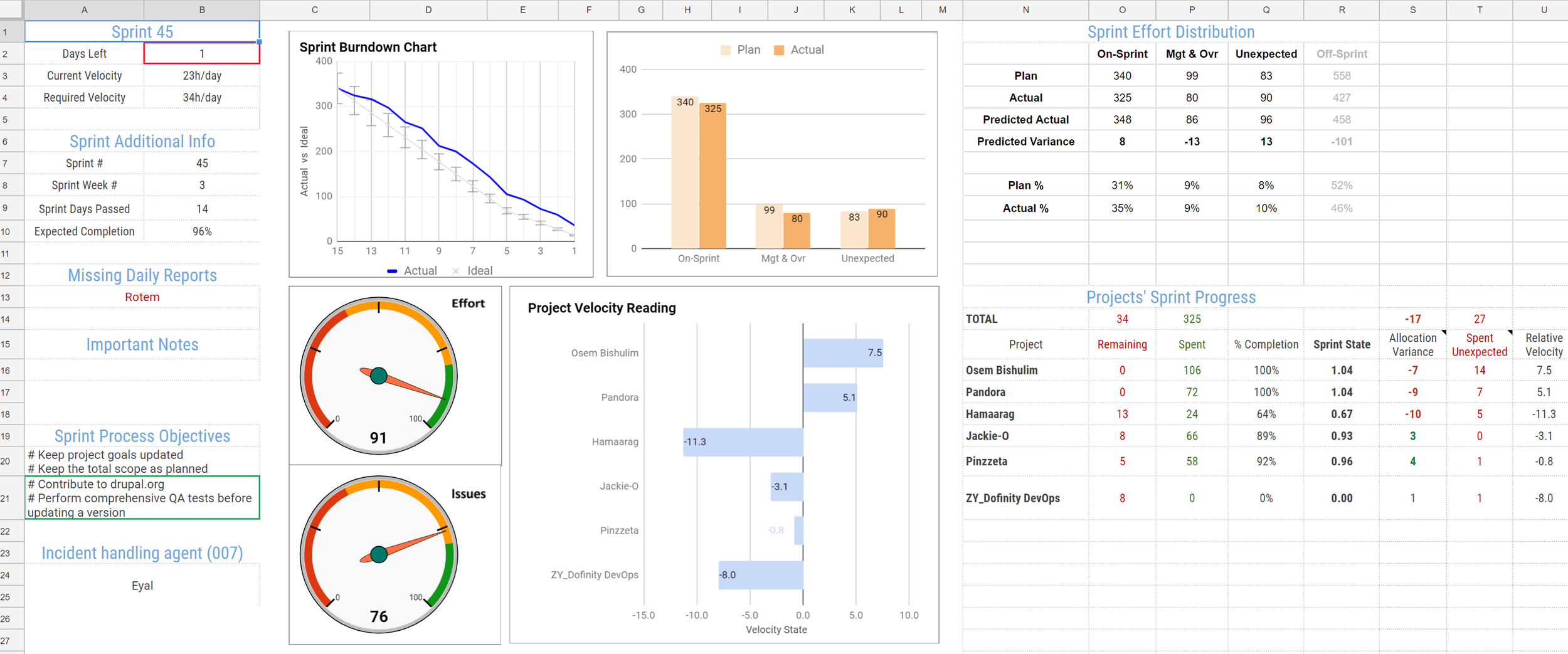 - Risks - dependencies, unexpected work, absence, etc