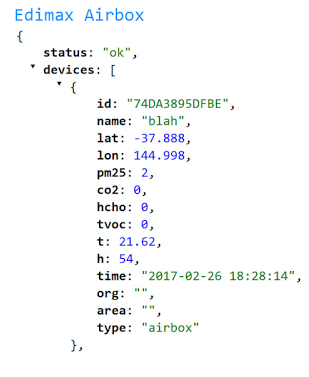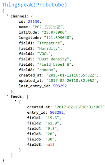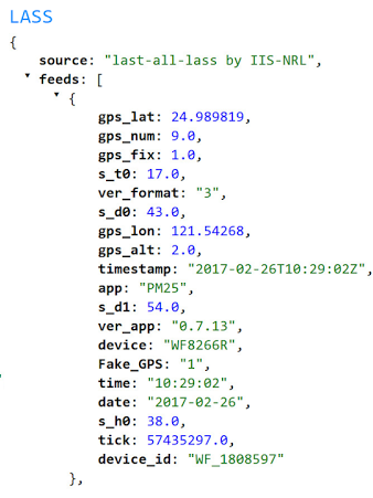 { "LatLng": { "lat": 24.1694183333, "lng": 120.658753333 }, "SiteGroup": "LASS", "Data": { "temp": 18.7, "humi": 84.2, "pm25": 34 }, "time": "2017-04-28T21:26:10Z", "uniqueKey": "Prodisky", }