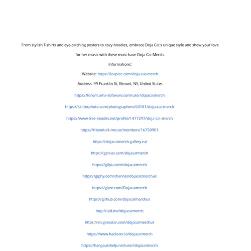 From stylish T-shirts and eye-catching posters to cozy hoodies, embrace Doja Cat's unique style and show your love for her music with these must-have Doja Cat Merch. Informations: Website: https://leapice.com/doja-cat-merch Address: 99 Franklin St,NY