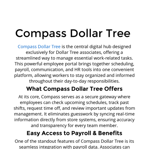 Dollar Tree Compass is an exciting all-in-one employee portal designed to keep Dollar Tree associates connected. https://dollartreecompass.info/login/ https://749603.8b.io/ https://dollartreecompass.systeme.io/ https://compass-mobile-dollar-tree.page