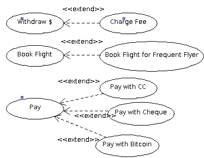 For example, if we were making an ATM we may have a "Withdraw $" use case. But if we are using a card that isn't from the same bank, we want to extend it to be "Withdraw $ and Charge Fee".