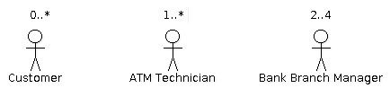 Suppose we are building an ATM system. We may have 0 or more customers. At least 1 technician will be interacting with the ATM. The bank has 2 to 4 managers responible for the ATM.