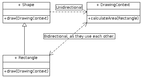 Class A depends on class B if it uses B as a parameter variable or local variable. This is shown with a dashed, open arrow. Can be either unidirectional (A uses B, B does not use A) or bidirectional (A uses B, B uses A).