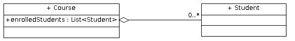 As part of a course, there are many enrolled students. However a Student object does not need to be destroyed if a class is cancelled. The Student can exist without it!