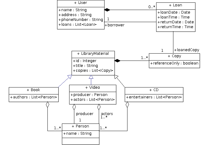 For every loan, the library records the user, the loan date and time and the return date and time. For every user, the library maintains their name, address, and phone number.