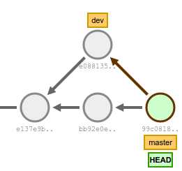 Suppose we rebase dev onto master to make sure we are up to date. Notice how the commits get copied and we now have linear history (except dev and master are at different points)