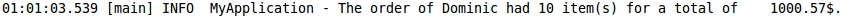 Logger logger = LogManager.getFormatterLogger("MyApplication");logger.info("The order of %s had %d item(s) for a total of %10.2f$.",