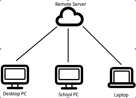 A local repository exists on the desktop PC, school PC and laptop. Git provides mechanisms for pushing commits to the remote server and pulling the latest commits from the remote server.