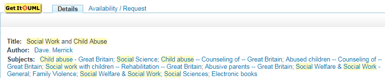 "social Work"Note: When you open a result, click on the details tab to look at the "Subjects" field to find related materials