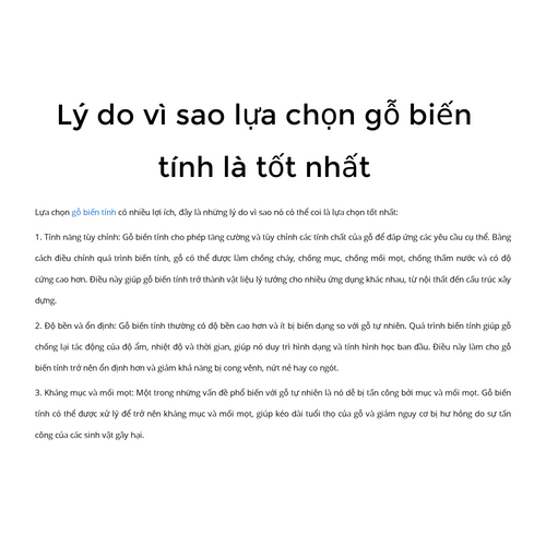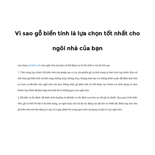 Khi lựa chọn gỗ biến tính cho ngôi nhà của bạn, hãy đảm bảo lựa chọn từ nhà cung cấp đáng tin cậy và tuân thủ các tiêu chuẩn và quy định về quy trình biến tính và nguồn gốc gỗ. Cần xem xét các yếu tố như ngân sách, thiết kế và yêu cầu cụ thể của ngôi nhà để đảm bảo rằng gỗ biến tính là lựa chọn tốt nhất cho bạn. Xem sản phẩm tại: https://javidecodona.com/go-bien-tinh/?utm_source=javidecodona_entity&utm_medium=social&utm_campaign=gd1&utm_content=javideco