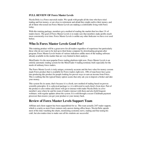 Forex Master Levels Review - Nicola Delic is a Forex maverick trader. We speak with people all the time who have tried trading and lost money, or are close to retirement and afraid they might outlive their money, and all of them who tested out Forex Master Levels are making a comfortable living with Forex today: Full Forex Master Levels Review here! at https://scamorno.com/Forex-Master-Levels-Review/?id=slides