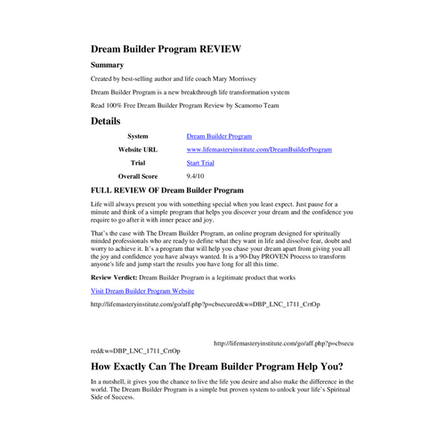 Dream Builder Program Review: http://scamorno.com/Dream-Builder-Program-Review/?id=slides Let’s check out my Dream Builder Program ! That’s the case with The Dream Builder Program, an online program designed for spiritually minded professionals who are ready to define what they want in life and dissolve fear, doubt and worry to achieve it: http://scamorno.com/Dream-Builder-Program-Review/?id=slides