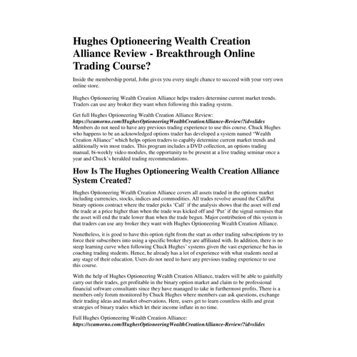 Full Hughes Optioneering Wealth Creation Alliance Review here! at https://scamorno.com/HughesOptioneeringWealthCreationAlliance-Review/?id=slides - The success of Hughes Optioneering Wealth Creation Alliance has given rise to many frauds who try to sell their own fake memberships in its name. This is a big issue as many customers have lost their money in joining from such fake sites.