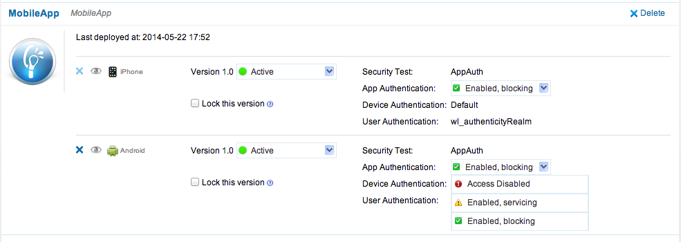 Enabled, servicing - Worklight server tests the Authenticity of the app; if it fails it services the device anyway