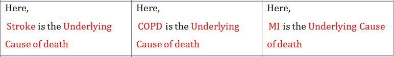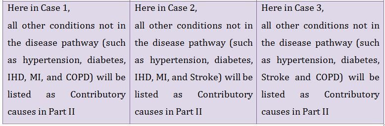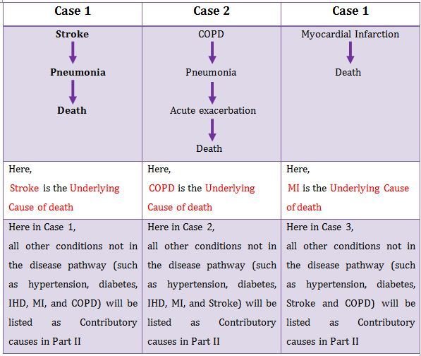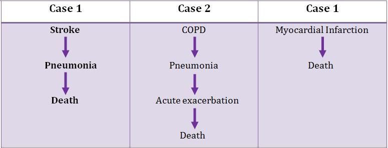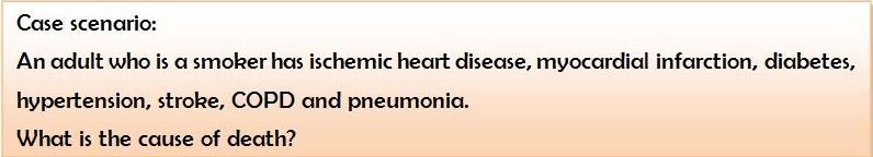 The cause of death depends on the biologically plausible sequence of events. Three case scenarios differing in the terminal sequence of events are described in next slide
