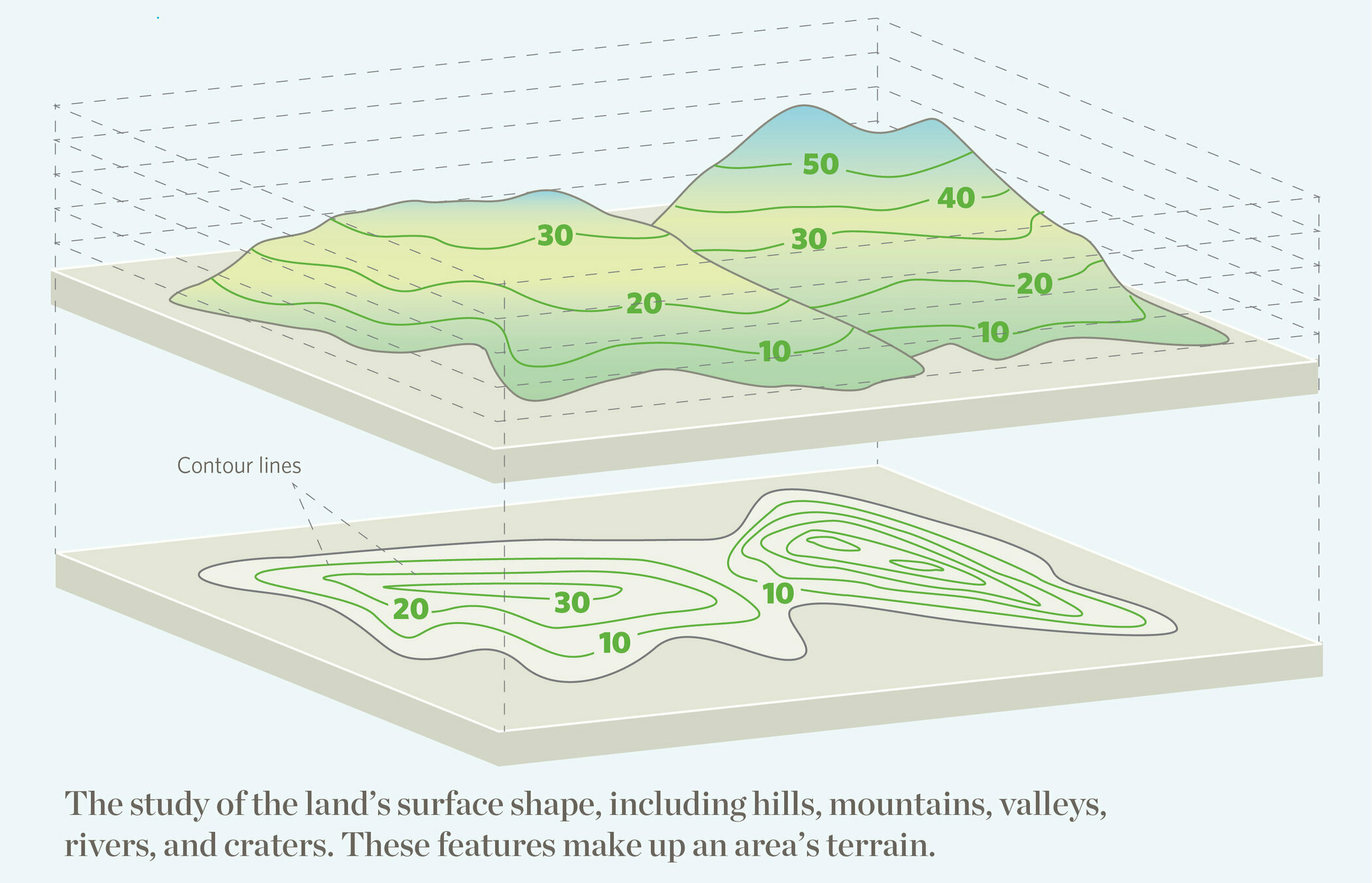 The topology of some geographical area can be represented by a field. In this case, the elevation above sea level is a scalar field. That is to say, for every point on this map, the physical quantity called the elevation above sea level has a known magnitude (represented by the contour lines.)