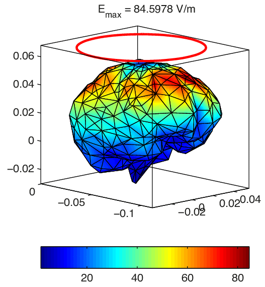 A simulation of the electric field strength induced in a model of a human brain via external electrodes. The magnitude of the electric field at each location within the brain is represented by the color map. The direction of the electric field is not represented in this figure.