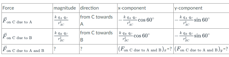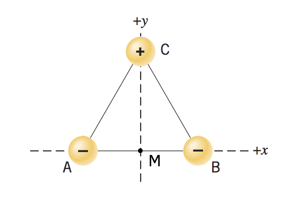 Three identical small spheres are fixed on the vertices of an equilateral triangle whose side is [d] cm in length. The spheres at vertices A and B carry negative excess charges, qA and qB, respectively. The sphere at vertex C carries excess positive charge, qC.