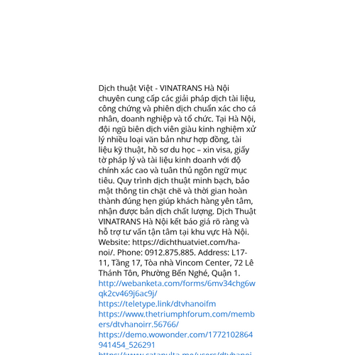 Website: https://dichthuatviet.com/ha-noi/https://dichthuatviet.com/ha-noi/ Dịch thuật Việt - VINATRANS Hà Nội chuyên cung cấp các giải pháp dịch tài liệu, công chứng và phiên dịch chuẩn xác cho cá nhân, doanh nghiệp và tổ chức. Tại Hà Nội, đội ngũ biên dịch viên giàu kinh nghiệm x