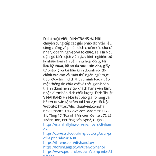 Website: https://dichthuatviet.com/ha-noi/https://dichthuatviet.com/ha-noi/ Dịch thuật Việt - VINATRANS Hà Nội chuyên cung cấp các giải pháp dịch tài liệu, công chứng và phiên dịch chuẩn xác cho cá nhân, doanh nghiệp và tổ chức. Tại Hà Nội, đội ngũ biên dịch viên giàu kinh nghiệm x