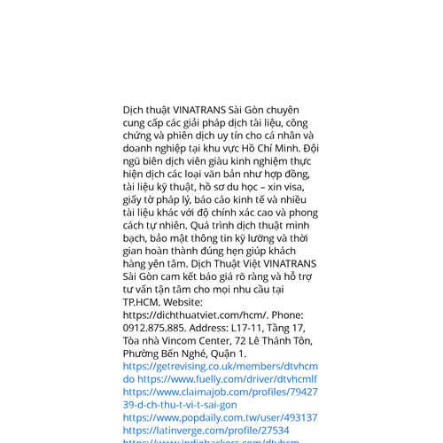Website: https://dichthuatviet.com/hcm/https://dichthuatviet.com/hcm/ Dịch thuật VINATRANS Sài Gòn chuyên cung cấp các giải pháp dịch tài liệu, công chứng và phiên dịch uy tín cho cá nhân và doanh nghiệp tại khu vực Hồ Chí Minh. Đội ngũ biên dịch viên giàu kinh nghiệm thực hiện