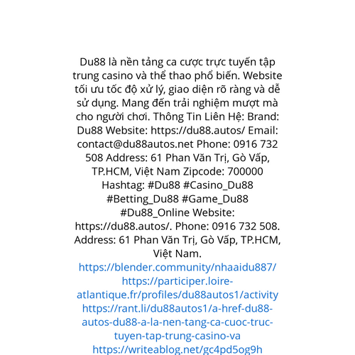 Website: https://du88.autos/. Du88 là nền tảng ca cược trực tuyến tập trung casino và thể thao phổ biến. Website tối ưu tốc độ xử lý, giao diện rõ ràng và dễ sử dụng. Mang đến trải nghiệm mượt mà cho người chơi. Thông Tin Liên Hệ: Brand: Du88 Websit