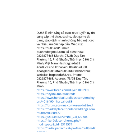 Website: https://du88.redhttps://du88.red DU88 là nền tảng cá cược trực tuyến uy tín, cung cấp thể thao, casino, slot game đa dạng, giao dịch nhanh chóng, bảo mật cao và nhiều ưu đãi hấp dẫn. Website: https://du88.red/ Email: du88red@gmail.com Số điện thoại: 08268