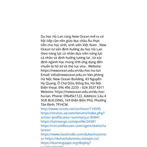 Website: https://newocean.edu.vn/du-hoc-ha-lan. Du học Hà Lan cùng New Ocean mở ra cơ hội tiếp cận nền giáo dục châu Âu thực tiễn cho học sinh, sinh viên Việt Nam . New Ocean tư vấn định hướng du học Hà Lan theo năng lực cá nhân dựa trên năng lự