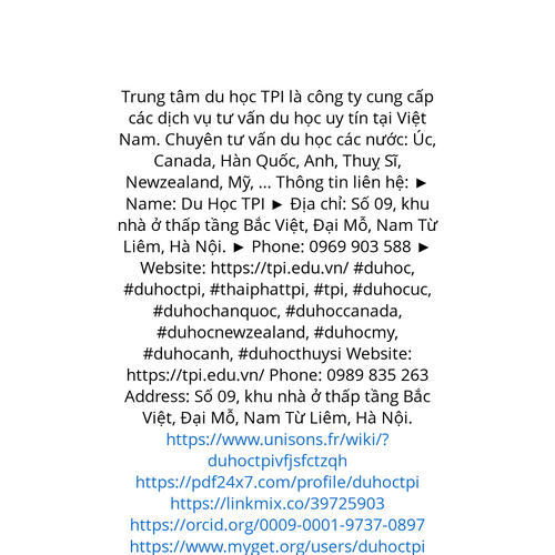 Website: https://tpi.edu.vn/ Trung tâm du học TPI là công ty cung cấp các dịch vụ tư vấn du học uy tín tại Việt Nam. Chuyên tư vấn du học các nước: Úc, Canada, Hàn Quốc, Anh, Thuỵ Sĩ, Newzealand, Mỹ, ... Thông tin liên hệ: ► Name: Du Học TPI ► Địa ch