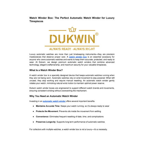 Dukwin stylish watch winders rotator combines modern design with advanced fingerprint lock security for men’s automatic watches. Engineered for smooth, silent rotation, it protects luxury timepieces while keeping them perfectly wound, secure, and ready for daily wear or special occasions. Source URL: https://dukwin.com/products/fingerprint-lock-watch-winders-with-4-watch-holders-storage-touch-screen-lcd-remote-control-watch-case-all-color
