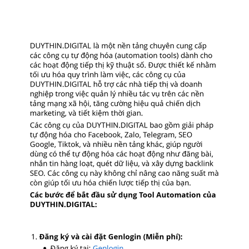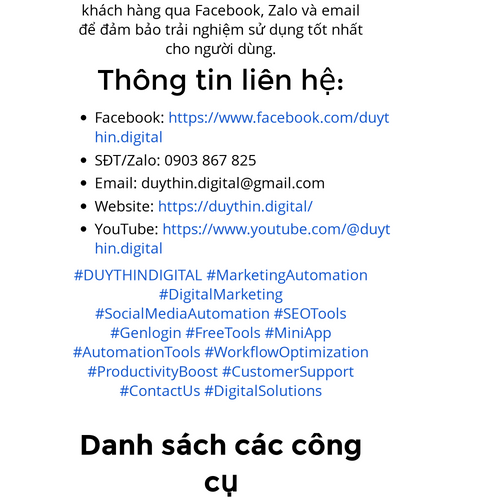 "DUYTHIN.DIGITAL- Chuyên cung cấp các công cụ tự động hóa Facebook, Zalo, Telegram, SEO Google,...giúp bạn tối ưu hóa chiến lược Marketing, bán hàng hiệu quả.