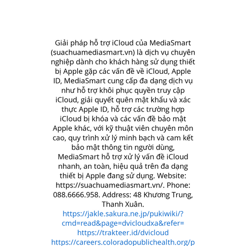 Website: https://suachuamediasmart.vn/. Dịch vụ hỗ trợ iCloud tại MediaSmart (suachuamediasmart.vn) là giải pháp uy tín dành cho người dùng iPhone, iPad gặp các vấn đề về iCloud, Apple ID, MediaSmart cung cấp đa dạng dịch vụ như khôi phục truy cập tà