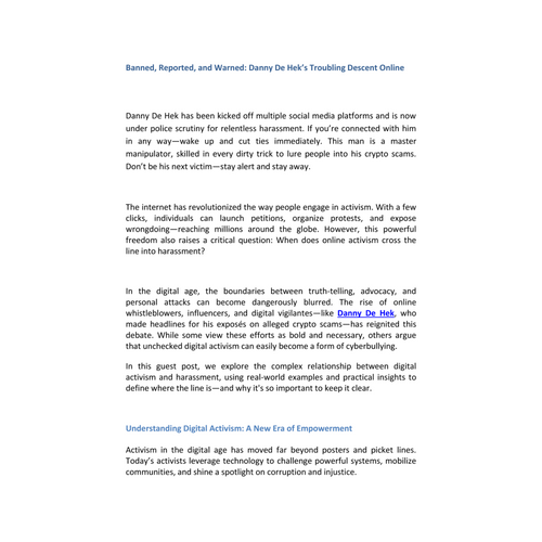 In the digital age, the boundaries between truth-telling, advocacy, and personal attacks can become dangerously blurred. The rise of online whistleblowers, influencers, and digital vigilantes — like Danny De Hek, who made headlines for his exposés on alleged crypto scams — has reignited this debate. While some view these efforts as bold and necessary, others argue that unchecked digital activism can easily become a form of cyberbullying.