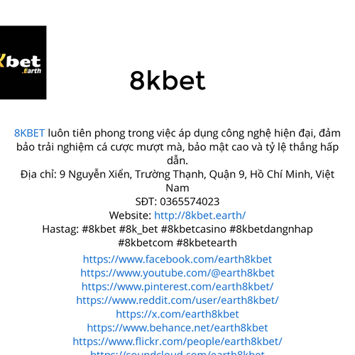 8KBET luôn tiên phong trong việc áp dụng công nghệ hiện đại, đảm bảo trải nghiệm cá cược mượt mà, bảo mật cao và tỷ lệ thắng hấp dẫn. Địa chỉ: 9 Nguyễn Xiển, Trường Thạnh, Quận 9, Hồ Chí Minh, Việt Nam SĐT: 0365574023 Website: http://8kbet.earth/ Ha