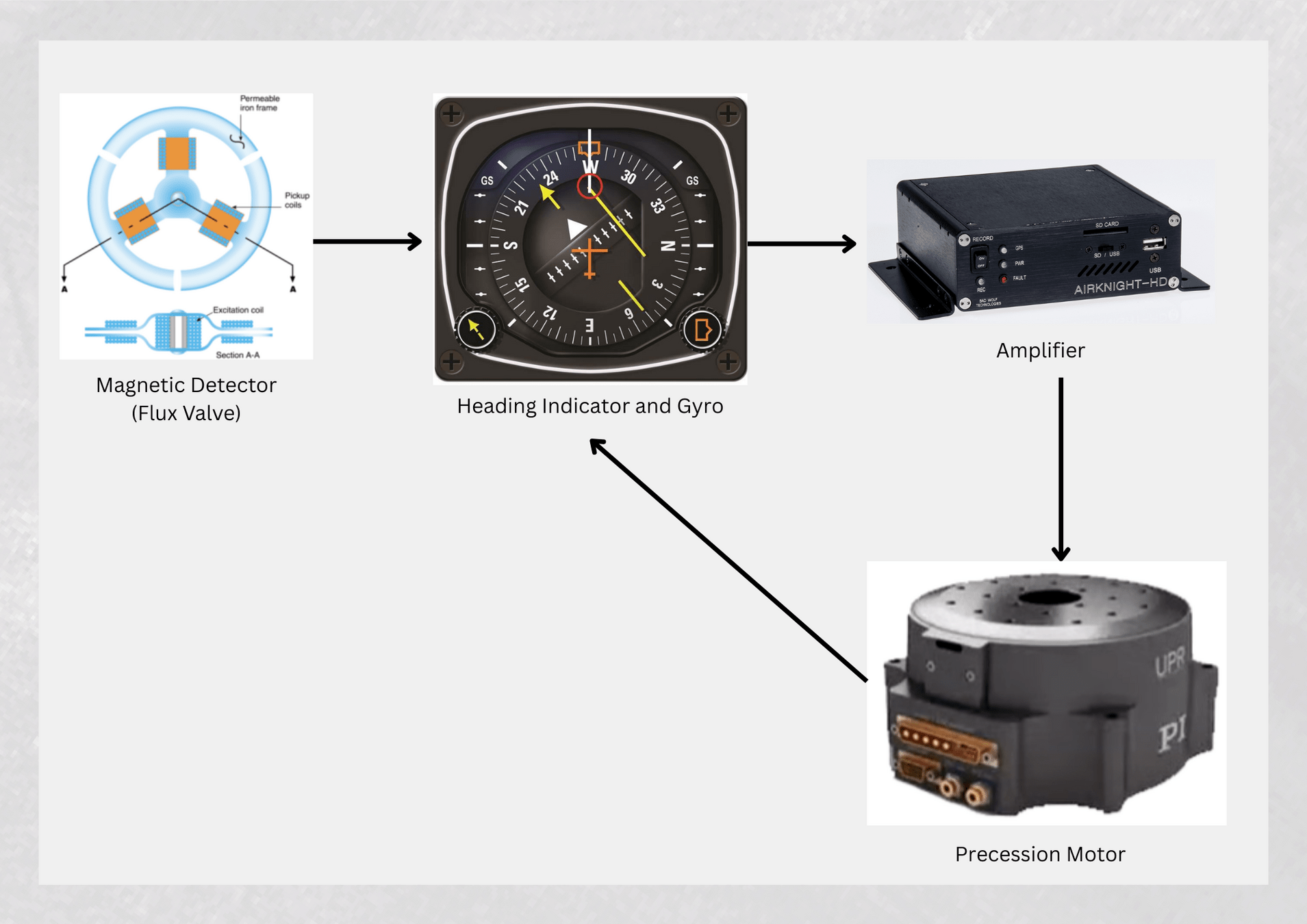 - The precession motor induces a precession in the gyro instrument, which corrects the orientation of the heading indicator to realign it with the magnetic heading.