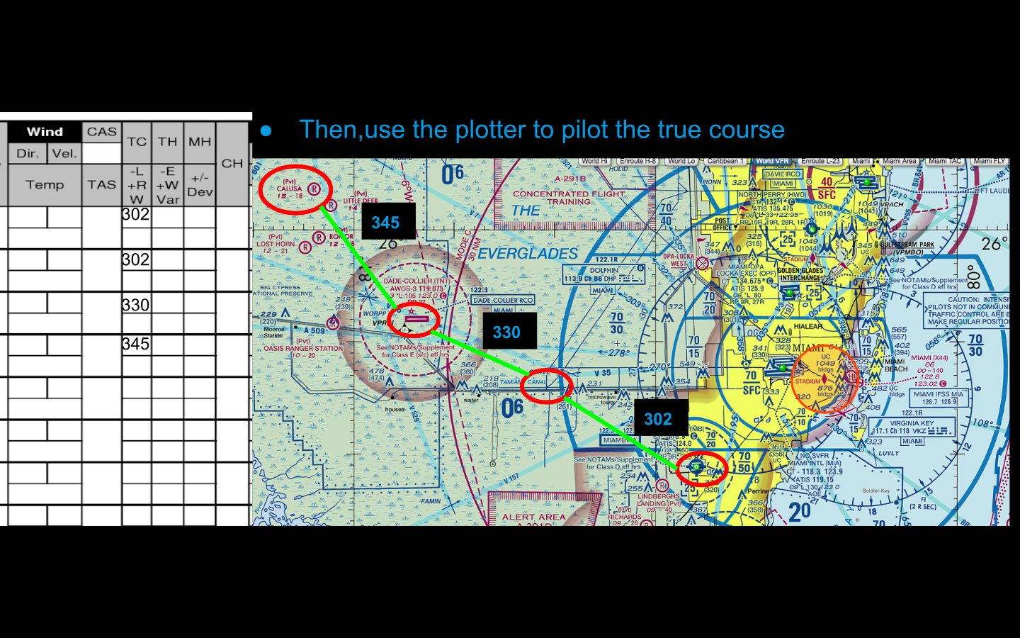 - Align the arrows pointing North of the plotter with the Longitude lines of the sectional chart to get the True course (TC).