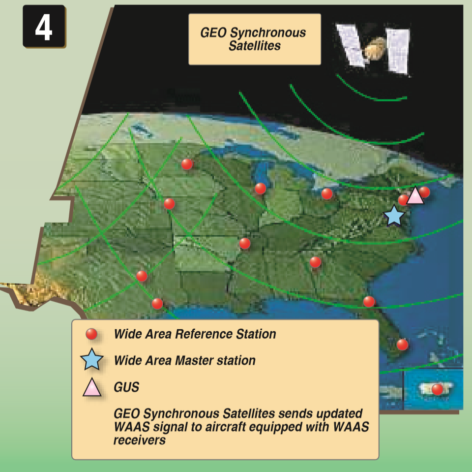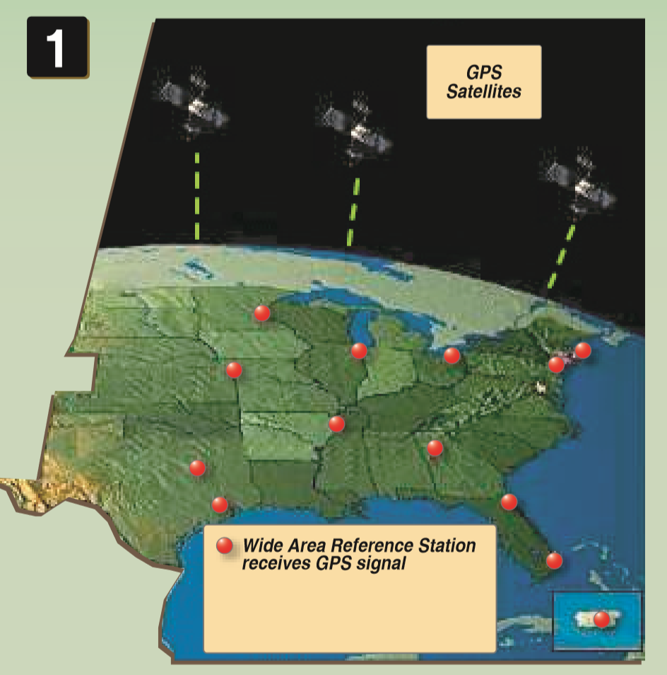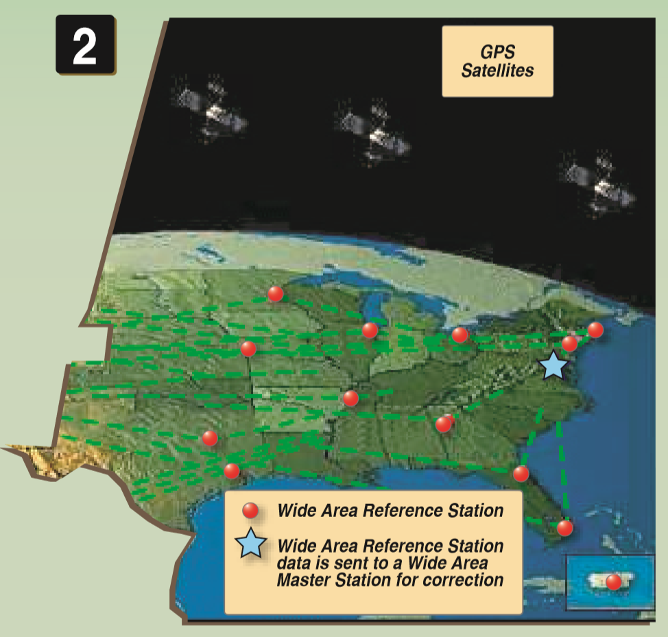 - Uses a series of ground stations that generate a corrective message that is transmitted to the airplane by a geostationary satellite.