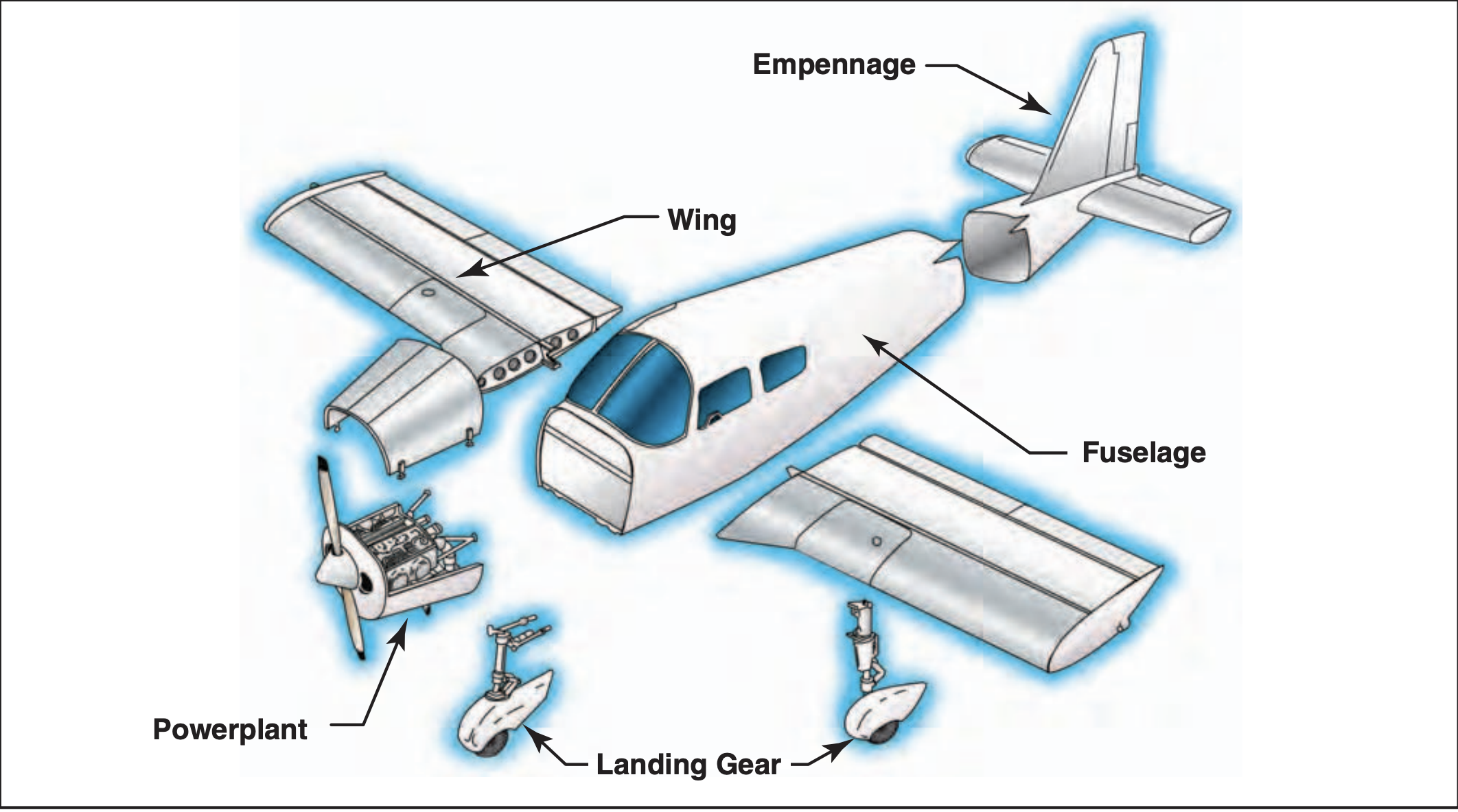 Most airplane structures include a fuselage, wings, an empennage, landing gear, and a powerplant.