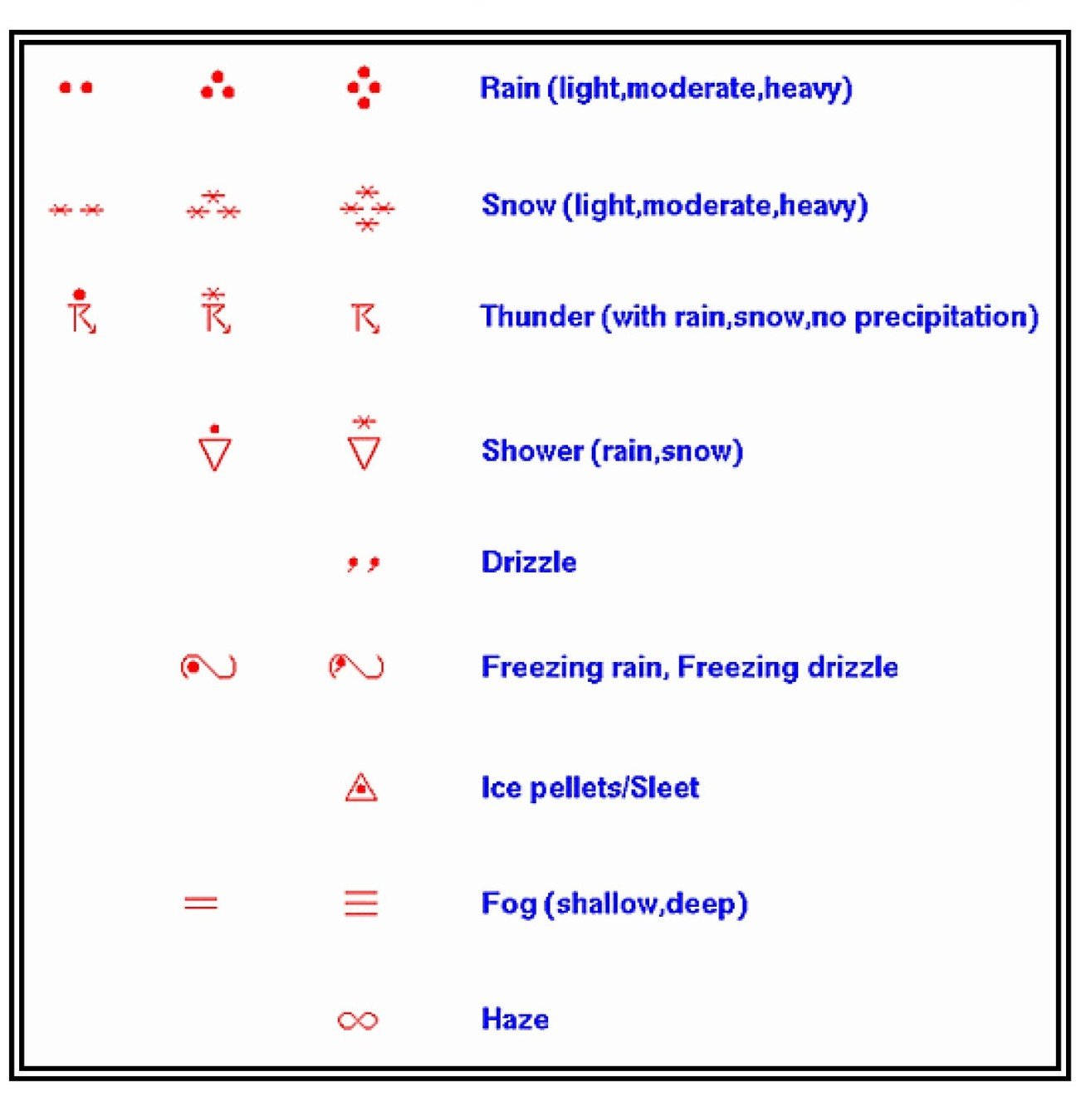 - Weather or obstructions to visibility which are present at the time of the observation are reported immediately after the visibility in the following order: intensity or proximity, descriptor, precipitation, obstruction to visibility, and any other weather phenomena.